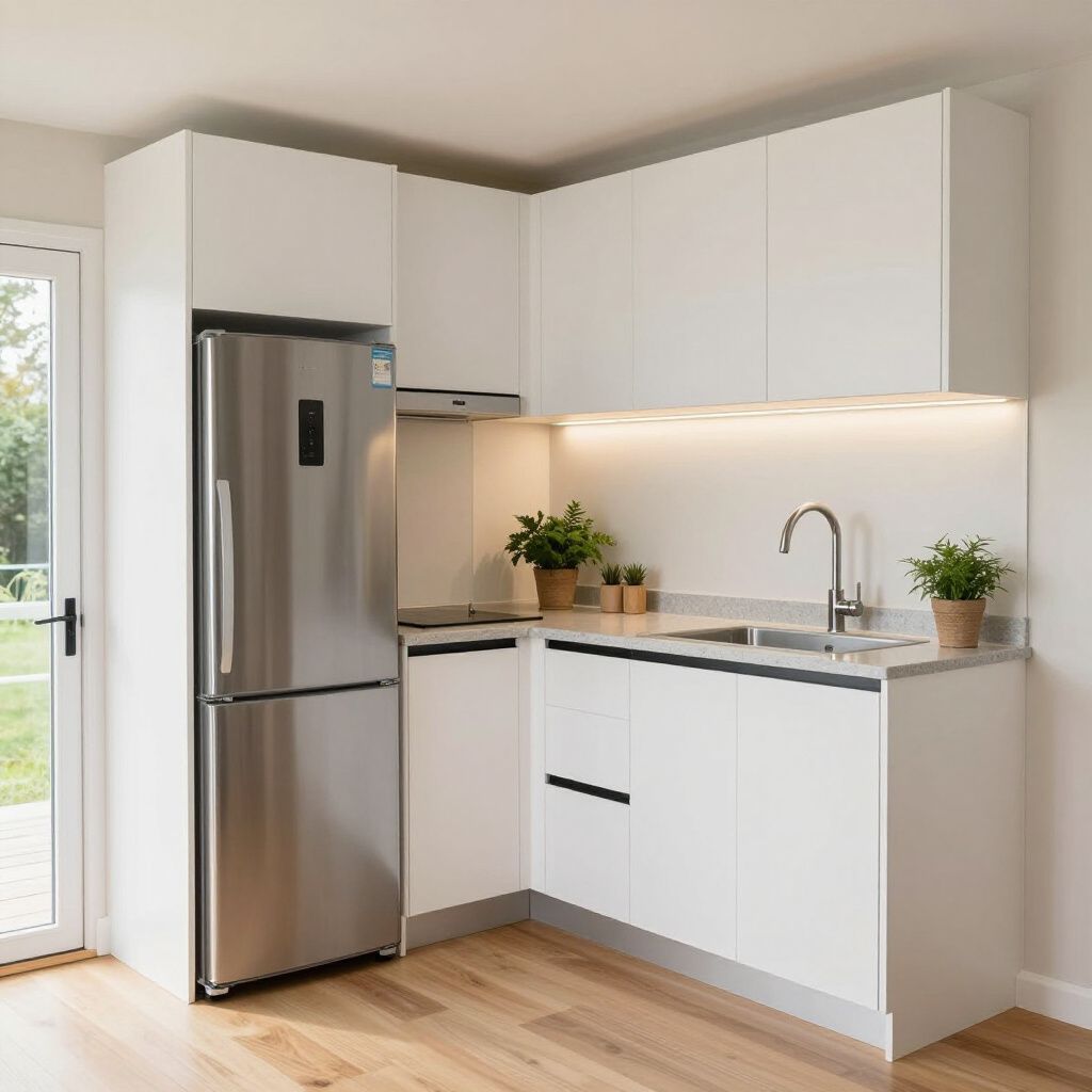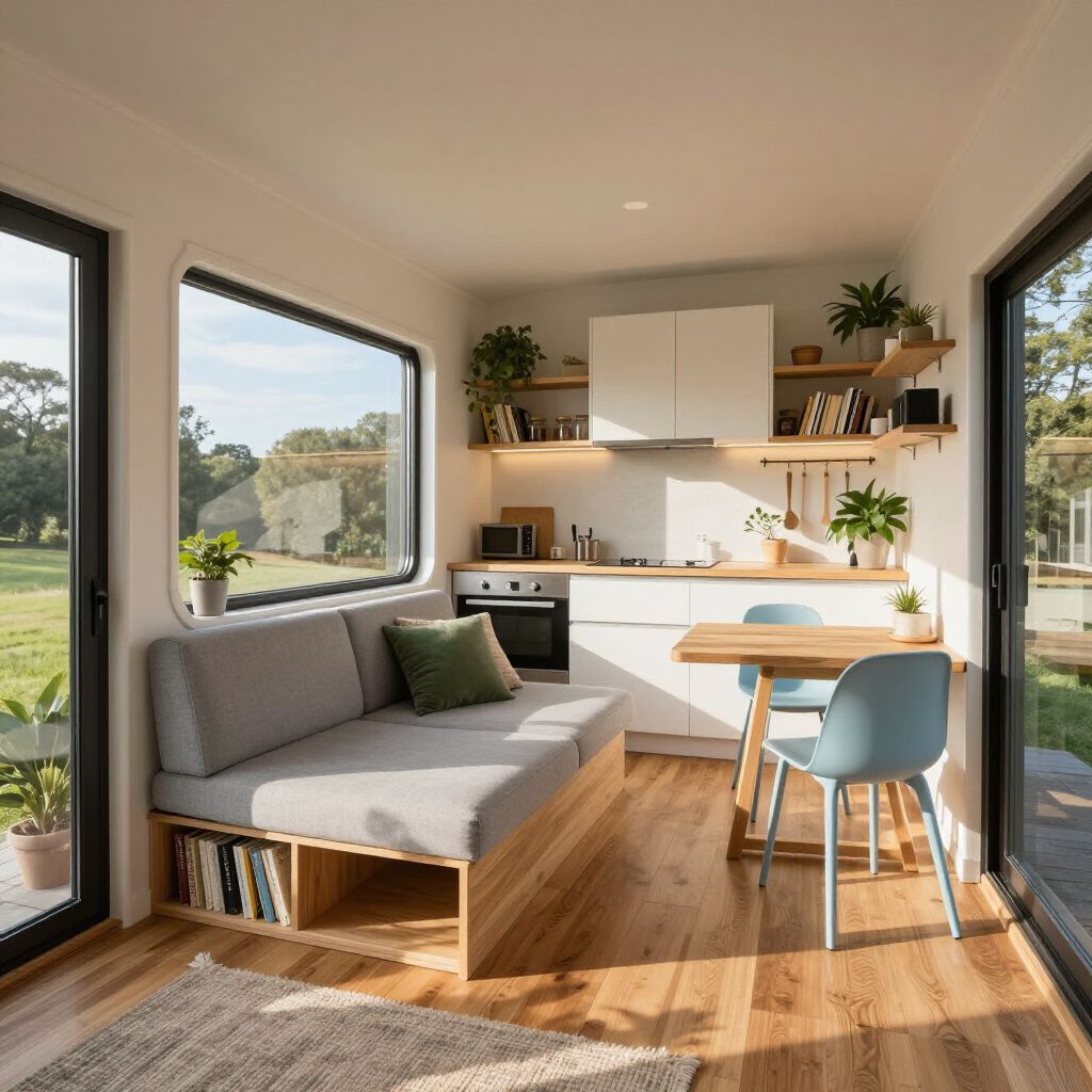 Compact yet fully equipped kitchen tailored for tiny home living, combining functionality with clean aesthetics.